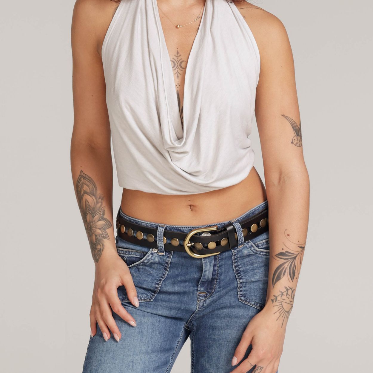 Plongez dans une fusion de charme robuste et de glamour vintage avec notre ceinture en cuir pour femmes Jasmyn. Dotée d'une superbe boucle dorée et d'une série de clous ronds fascinants, cette ceinture est conçue pour ajouter la touche parfaite à votre tenue. Fabriquée à la main pour ceux qui souhaitent rehausser leur garde-robe en jean, Jasmyn associe sans effort le charme robuste aux éléments d'inspiration vintage.