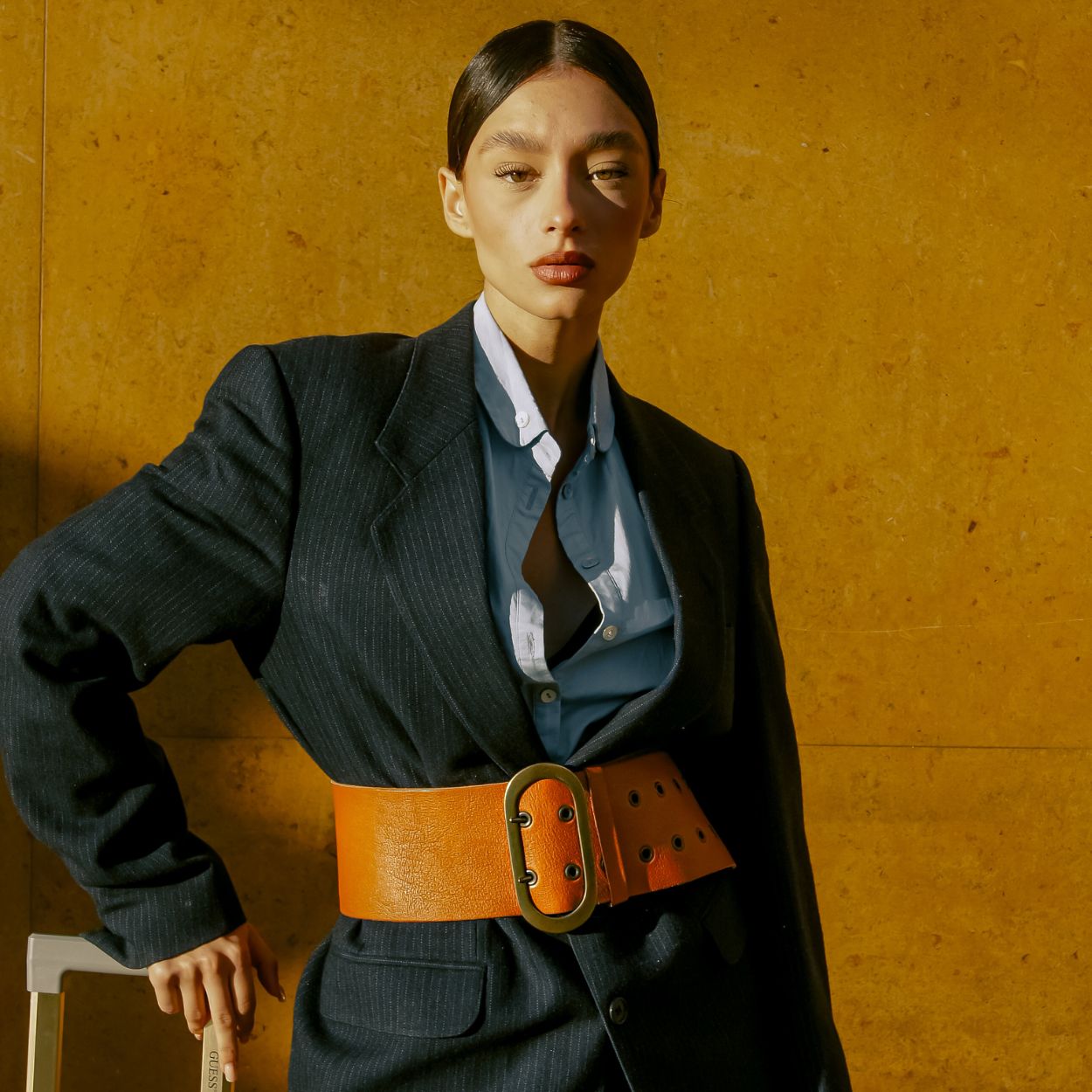 Le Rena ultra-large est une ceinture taille audacieuse pour toutes vos envies de tenues habillées. Cette large ceinture pour robes et combinaisons est décontractée et moderne avec sa boucle ronde ancienne dorée arrondie.